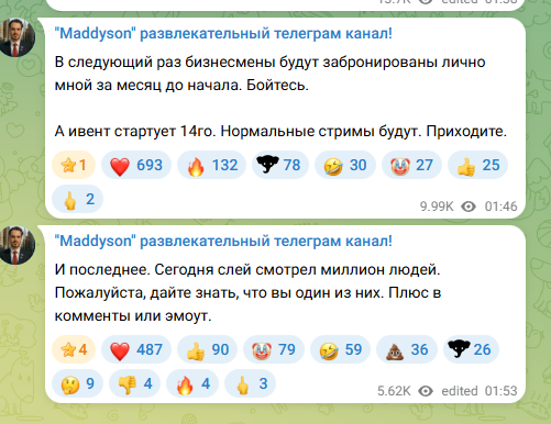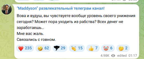 Как вы думаете, будет ли вся эта пиздобратия как-нибудь мстить Мэддисону? Если да, то как? Удивительно, но Дианочка решила не реагировать, но кураторы этой хуйни и люди, которые за ними стоят, явно способны и на какое-нибудь зло.