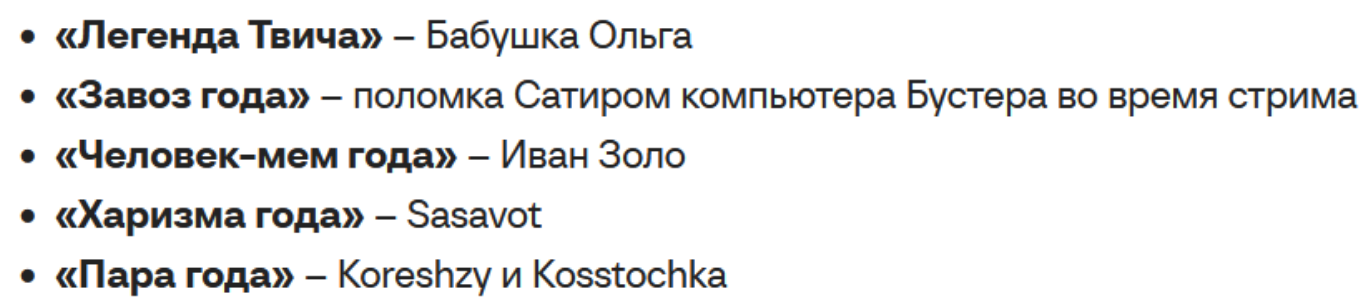 А почему в номинантах Легенда твича не было Илюхи мэда, братишкина, арравудуса? Кто такая эта Ольга? У нее тупо 2 клипа в первом она эйс делает, в втором ее забулили и она сказала ну ничего бывает и такое и всё, где там лега?