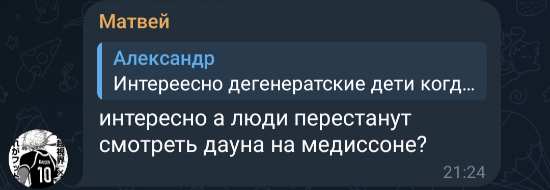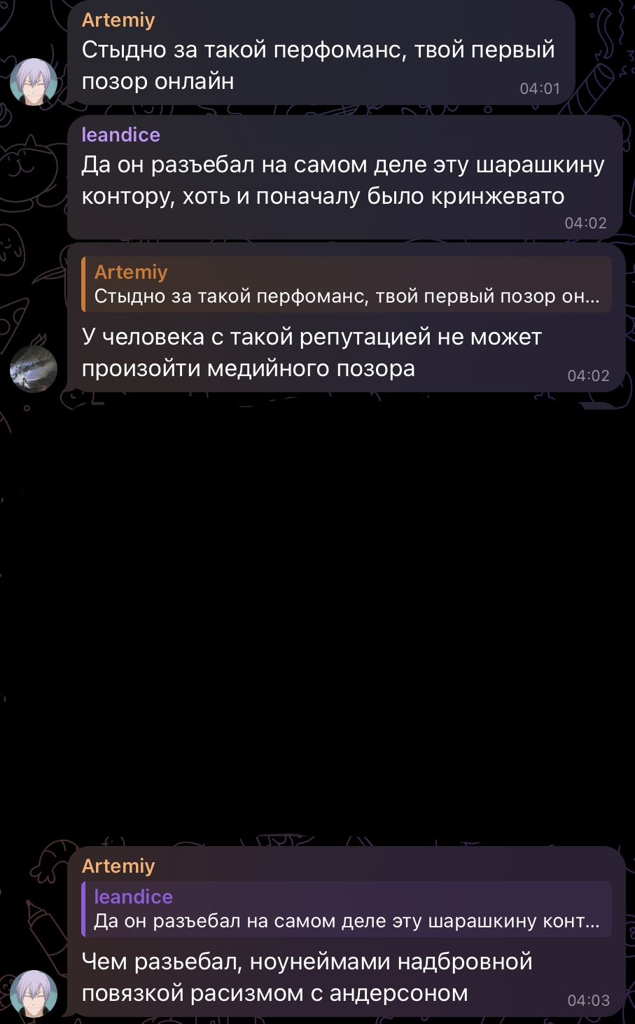 пиздец эти дегенераты теперь у нее сидят и гнобят за то, что девочка не стала опускаться до уровня диких приматов, я хуею... надеюсь ей хватит менталки профильтровать подобных додиков и не обращать на них внимания + не потерять самооценку и не стать закомплексованной из-за того, что не зашла каким-то рандомным уебанам-зрителям чмодья, у которых орущий кривляющийся и наряженный пидорасом скуф является апогеем контента и вызывает гыгыгы