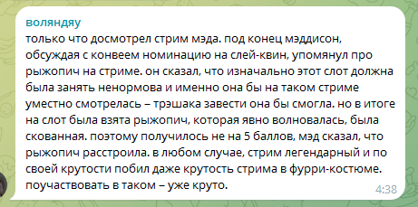 я конечно дико кринжанула с начала стрима илюхи мэда, но после того как началось награждение и появился звук с основной трансляции - у меня все вопросы от этого сиськотряса отпали...