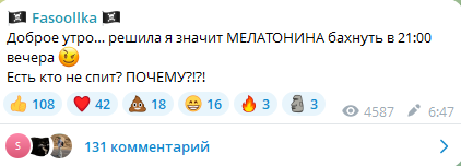 Опять пиздешь. Говорит что выпила мелатонин в 21:00 его как раз перед сном пьют. Но в 21:40 записываешь кружок что сидишь играешь. А последняя игра вообще закончилась в 22:19. Походу всю ночь не спала а пост этот как раз только перед сном написала чтоб ее не теряли с утра.