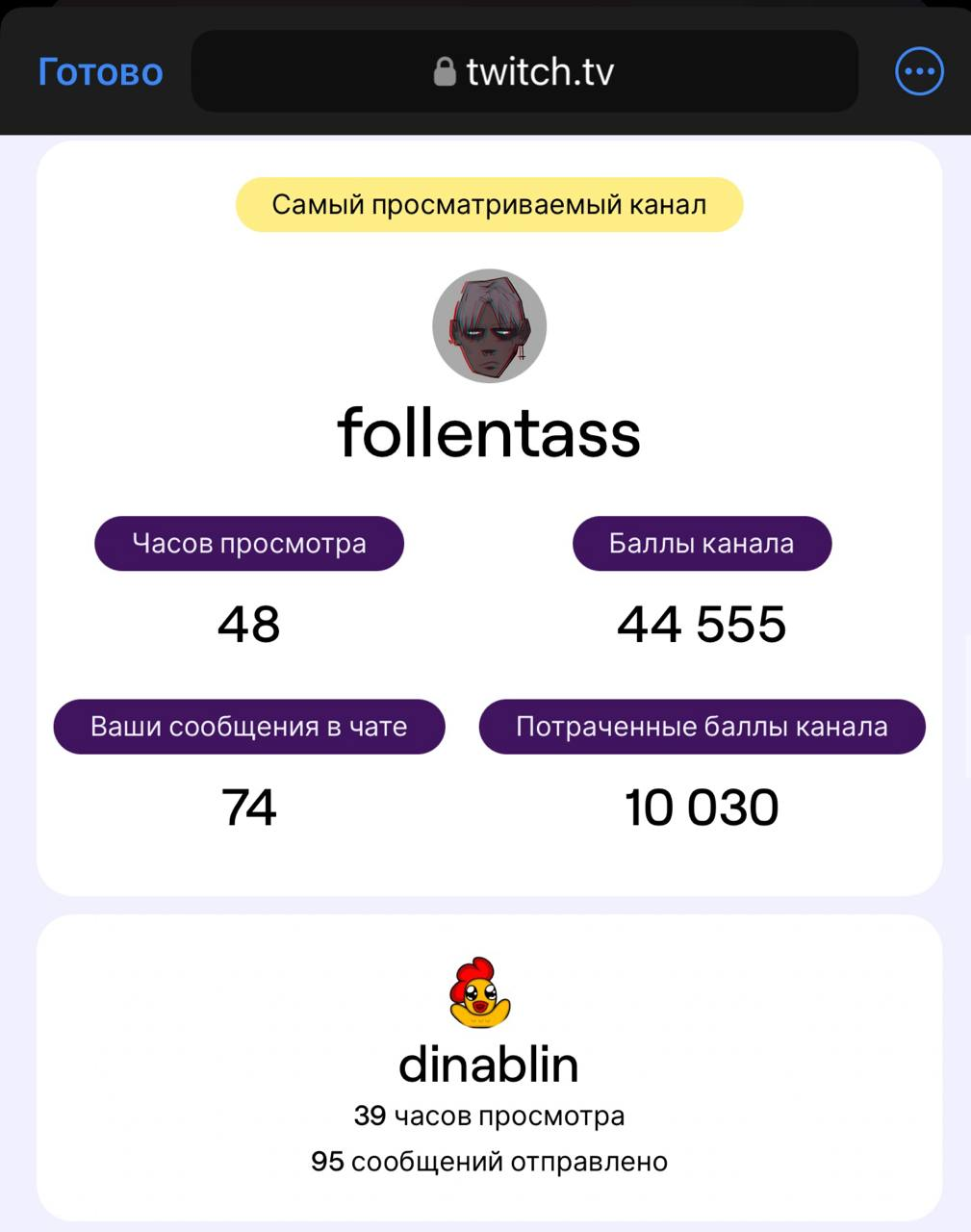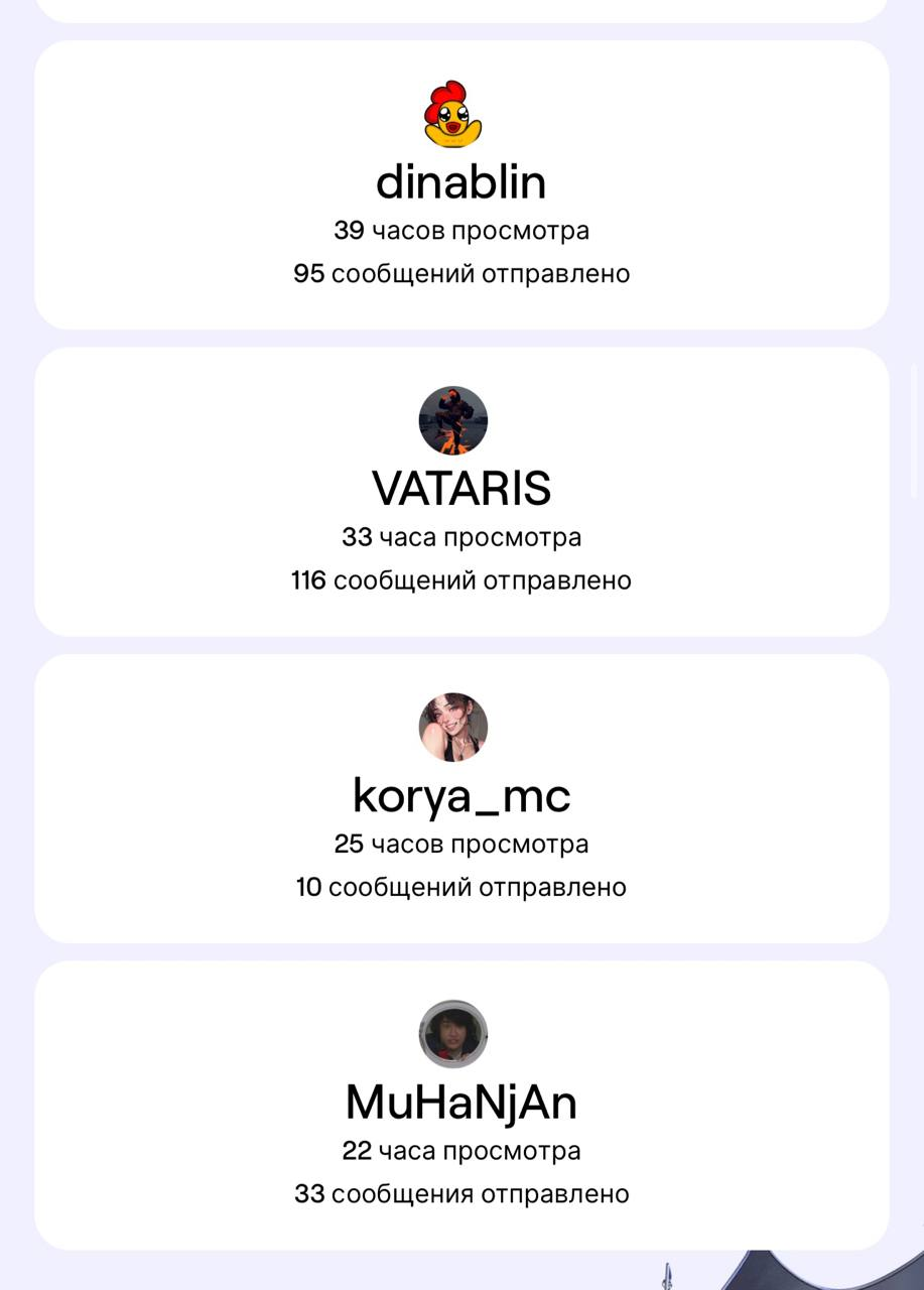 Она скинула, но мб это не ее стата, а с др канаоа, мразолька мб. В первый раз когда спросили и она в чате отписалась, там был явный пиздешь, ибо назвала она 6 ников, а не топ 5 как там отобрадается. Просто с головы взяла наверное)) Думаю там в топе номанз будет и линанеон не отображается у нее, хотя она у нее дастаточно долго зависает на стримах, явно больше 22х часов в год)) Так что да, думаю это стата либо мразольки либо левого акк