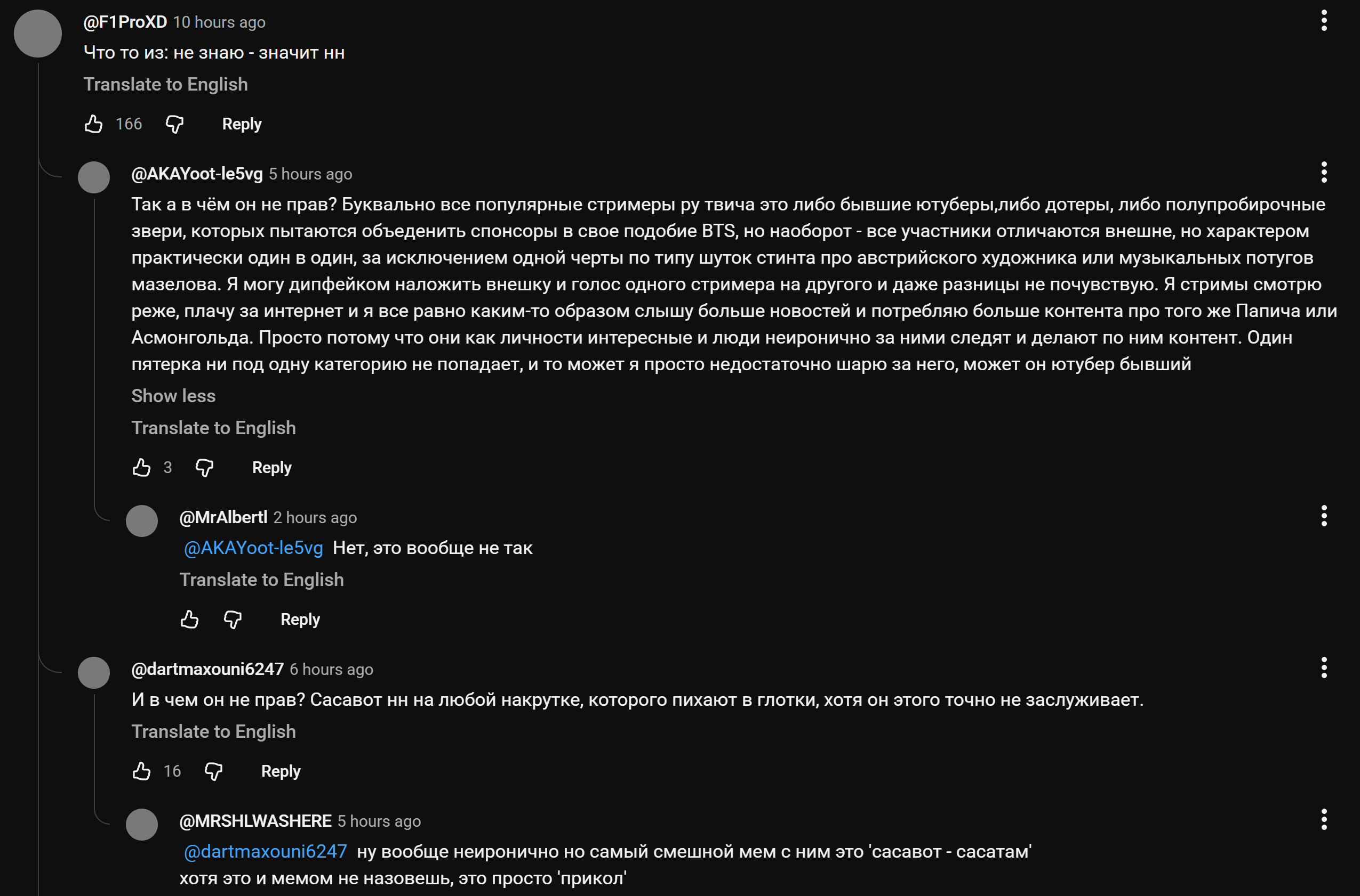 Почему никто не верит в популярность всех этих стримеров? Все кто это говорят, как будто даже никогда и не смотрели твич. Например, победитель стримера года на пикриле, Сасавот это реально интересный и смешной стример с большой аудиторией, а главное он ДОБРЫЙ. Он не душнит, не оскорбляет никого, никого не высмеивает. Он завозит контент БЕЗ разжигания ненависти. Даже на твиче есть злые стримеры. Могу привести в пример денжерлеху, который на ютубе ШАРФ. Мне он тоже нравится как стример, но как он всех оскорбляет... Своих коллег-девушек, обзывает шлюхами, шмарами и т.д. Это банально отпугивает. Глеб Сасавот, на пикриле, в свою очередь, никого не оскорбляет, только если на него не прыгнут. Он добрый и может смешить и без этого.