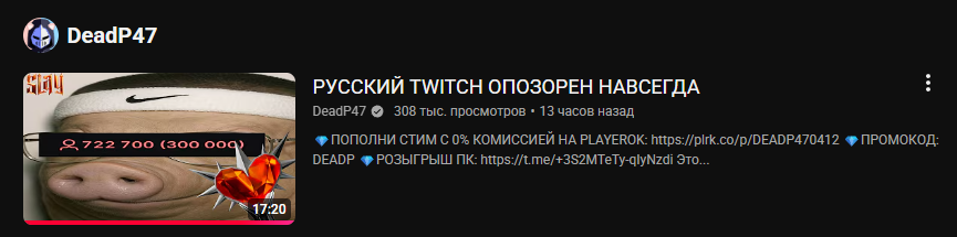 308 тыщ за 13 часов, это самое ебанутое видео по просмотрам, хотя он просто пустопорожний кал прогнал там. статистика лучше, чем у видео про отрыжкина. это илюха крутит 100%