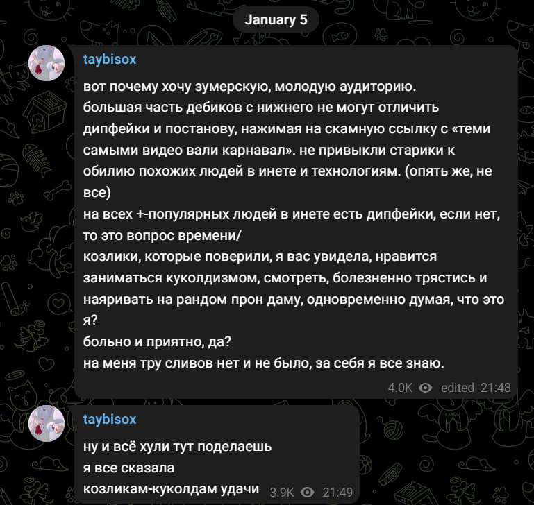 При этом донатили ей в 2024 в разы больше, кто помнит СВОшника щедрого? я аще ахуй хуй знает как она выживает и ведёт такой образ жизни на одну бабкину пенсию сандалика, лечит зубы, путешествует, айфоны, билеты в токио, ещё у неё вклады в банке имеются сказала, спрашивает куда инвестировать можно, 99% богатый теневой имеется