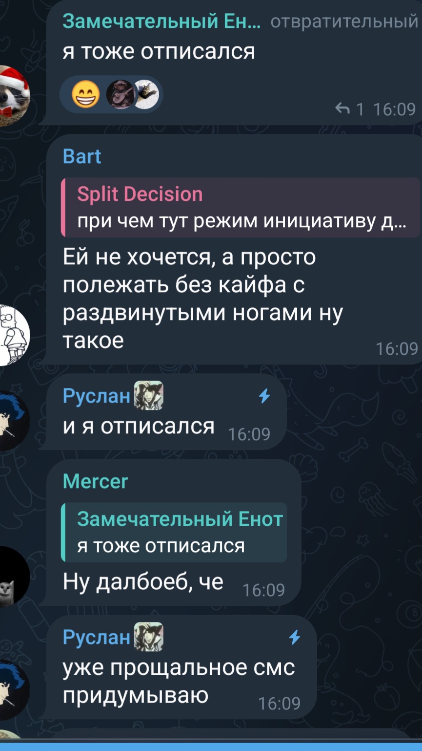 Вам смешно, оно и понятно будет, но даже если это все затянувшаяся шутка, я реально не могу уснуть от этих новостей) Мне пиздец хуево, и это все сразу после новостей от тайби про Улю) Пиздец, я уже на все согласен, лишь бы это все прекратилось и шутка подошла к концу иначе я не знаю как быть дальше даже, я не хочу забывать её и все что было кем она была для меня и я надеюсь еще будет