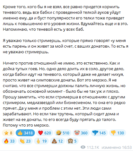 >>25709317 >Во первых там реальных было 30к+ Вряд ли. Он недавно говорил, что на сплошных лудостримах растерял аудиторию и репутацию. Здесь в ГС называет 30к онлайна бесстыжим https://t.me/maddysontg/5250 Когда признался, что 200к это его "бизнесмены", было 213к онлайна. Он пожаловался, что никто не помогает, и тогда уже онлайн начал расти до 255к. Позже уточнил, что накрутил 210к. Когда попросил писать в чат "заза" вместо "база", за 2 минуты это сделали 500 уникальных юзеров. А тут в клипе рассуждает о своих 7к онлайна, надеясь на буст от Дианы. Вчера он её вспоминал в мягких тонах, демонизируя Слэй. Думаю, в пике было до 10к живого онлайна. Об эффекте дальнейших нарезок судить не могу, но он бы явно зависел от свершений Ненормовой, как при любой коллабе. Какой стресс вызовет осознание ответственности и какой контент можно выдавать в таком состоянии?