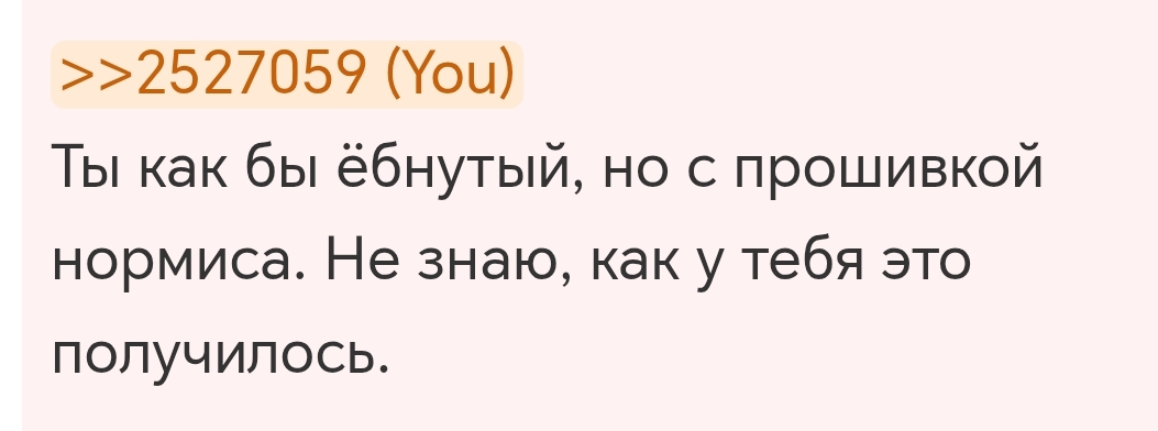>>25734227 Сомневаюсь, добрый я с друзьями только, там атмосфера такая, что и злиться то не на что. А вы, ну мне просто похуй на вас, поэтому и пишу всякие гадости.