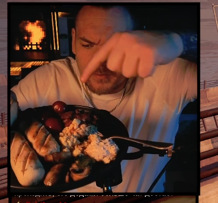 Ебать он ЖРЕТ нахуй с утра. У работяг таким обед бывает. А он просто сидит и жрет.