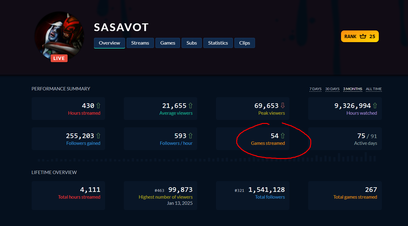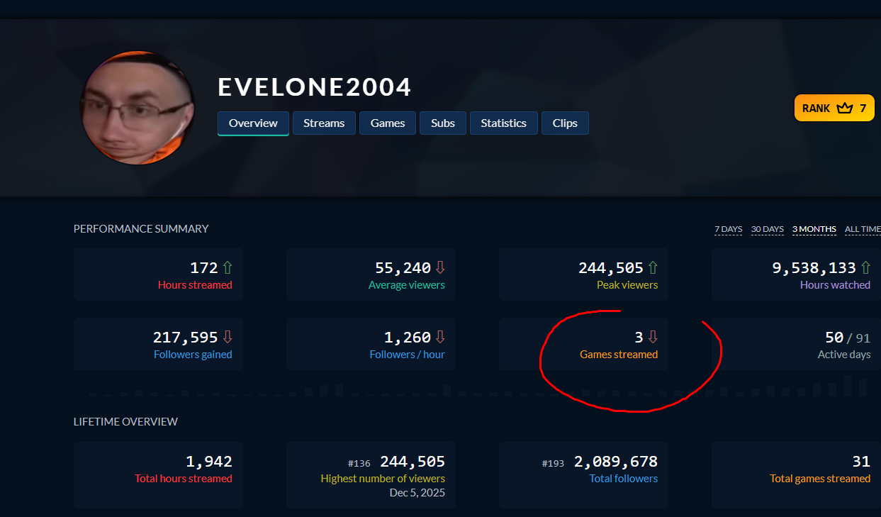 У меня впервые за карьеру 100 к онлайна среднего за неделю (с) Эвил Ну про что я и говорил,как же он дрочит на свою стату,у него Твич трекер открыт 24 на 7 и он смотрит и смотрит,смотрит на каком месте он по фолловерам в мире и тд