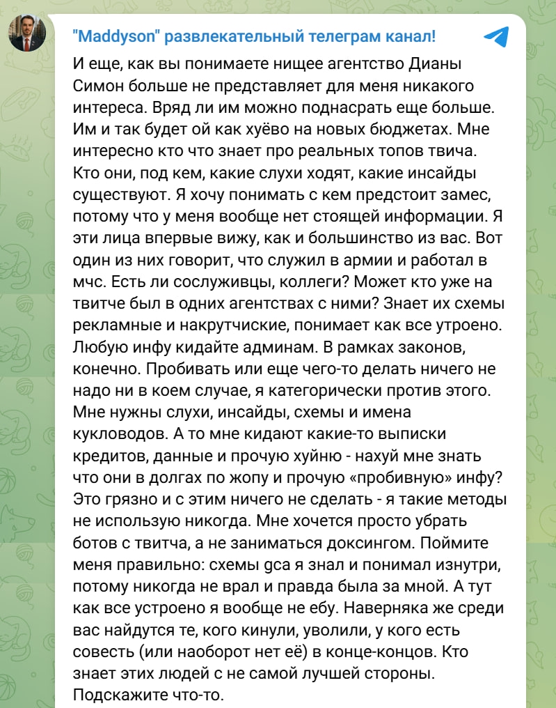 королевский мув был бы внедрить своего стримера в их тусовку (лучше не в дианочкину, а к евелону бубстеру) и чтобы он слил всю инфу но за такое реально могут в лесополосе закопать по идее