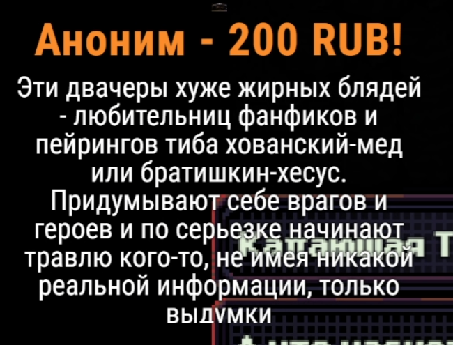>>25747380 >Имаджинируйте приходить с работки с заводика, слать свои нищие 2 сотки и оправдывать тех кто рубит по 4-5 лямов в месяц. тож рофлю, жопич уже донаты даж не читает, ни один донат на слее не был отвечен и на зрителей ему поебать, сидит на ботов стримит и крутит бурмалду, а живые зрилы донатят по 200р, эти копейки, да еще и в рублях, а не долларах, ваще охуели, мешают