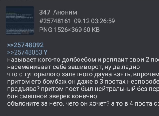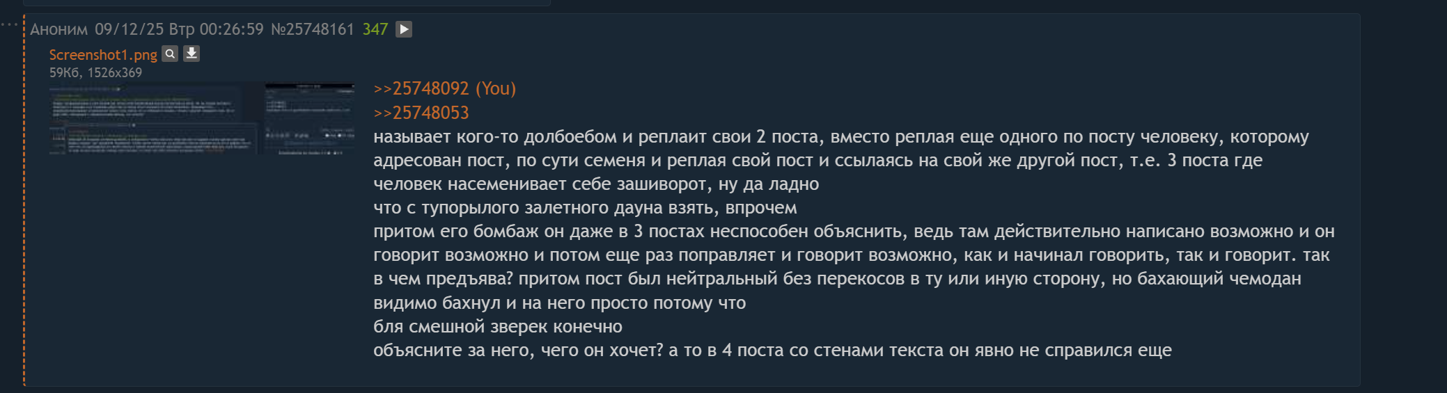>>25748092 >>25748053 называет кого-то долбоебом и реплаит свои 2 поста, вместо реплая еще одного по посту человеку, которому адресован пост, по сути семеня и реплая свой пост и ссылаясь на свой же другой пост, т.е. 3 поста где человек насеменивает себе зашиворот, ну да ладно что с тупорылого залетного дауна взять, впрочем притом его бомбаж он даже в 3 постах неспособен объяснить, ведь там действительно написано возможно и он говорит возможно и потом еще раз поправляет и говорит возможно, как и начинал говорить, так и говорит. так в чем предъява? притом пост был нейтральный без перекосов в ту или иную сторону, но бахающий чемодан видимо бахнул и на него просто потому что бля смешной зверек конечно объясните за него, чего он хочет? а то в 4 поста со стенами текста он явно не справился еще