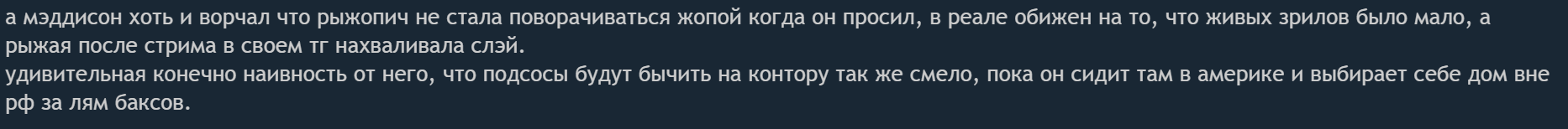 >>25747752 >>25747757 Вы думаете Илюха тоже по своей воле уехал в США? Усачев на годы затратил обиду после того, как Илья называл его пидарасом. Просто довольно долго у Мэда была крыша - депутат Власов и все дела. Но когда он ее лишился - к нему стали появляться вопросы.