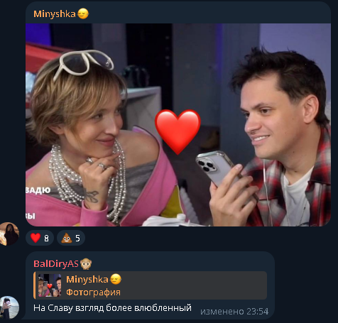 А, Наташа реально лайкает шип эдиты с Бустером, думал чел вкинул вчера, ну понятно короче. Не знаю как вы, но я все же хотел увидеть их с Вадимом вместе снова, но как есть уже. По Вадиму было сегодня видно, что его задели эти стримы со Славой, он чисто из-за того что обещал этот «конфликт» позвонил ей, как будто на отъебись общался, да и в конце стрима на её сообщение в чате ответил не очень то и дружелюбно.