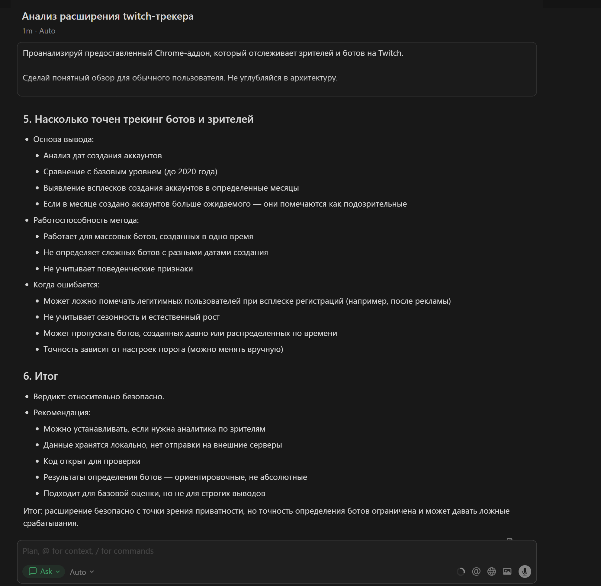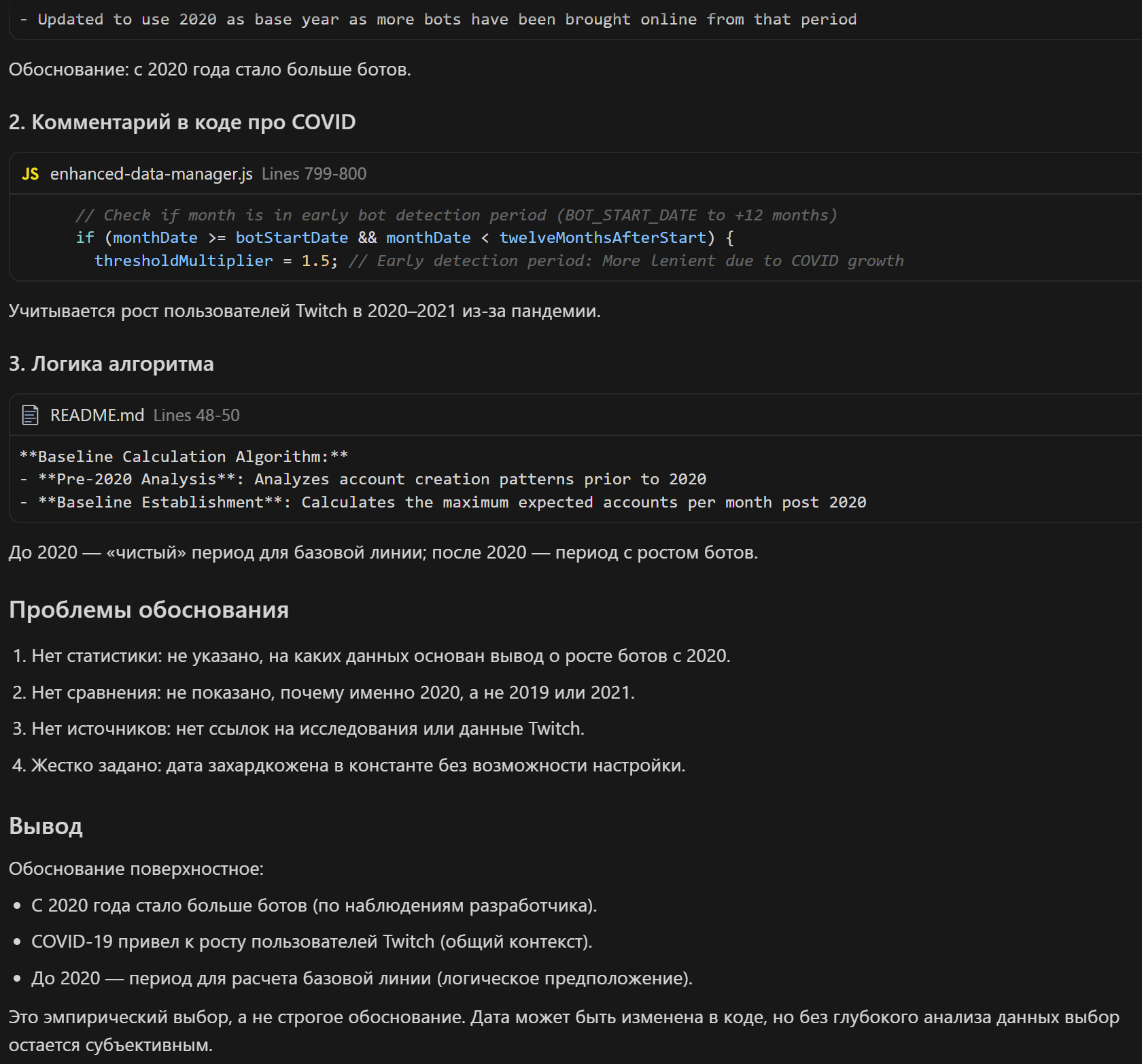 >Алгоритм расчета базового уровня: Анализ до 2020 года: Анализирует закономерности создания учетных записей до 2020 года. Установление базового уровня: Рассчитывает максимальное ожидаемое количество учетных записей в месяц после 2020 года. Обнаружение пиковых значений: Определяет месяцы, в которые количество созданных учетных записей значительно превышает базовый уровень. Автоматическая классификация: Учетные записи, созданные в периоды пиковых значений, помечаются как потенциальные боты, игнорируя половину базового уровня как реальных пользователей. Удаление ложноположительных результатов: Отображается только итоговый процент ботов, превышающий 10%.