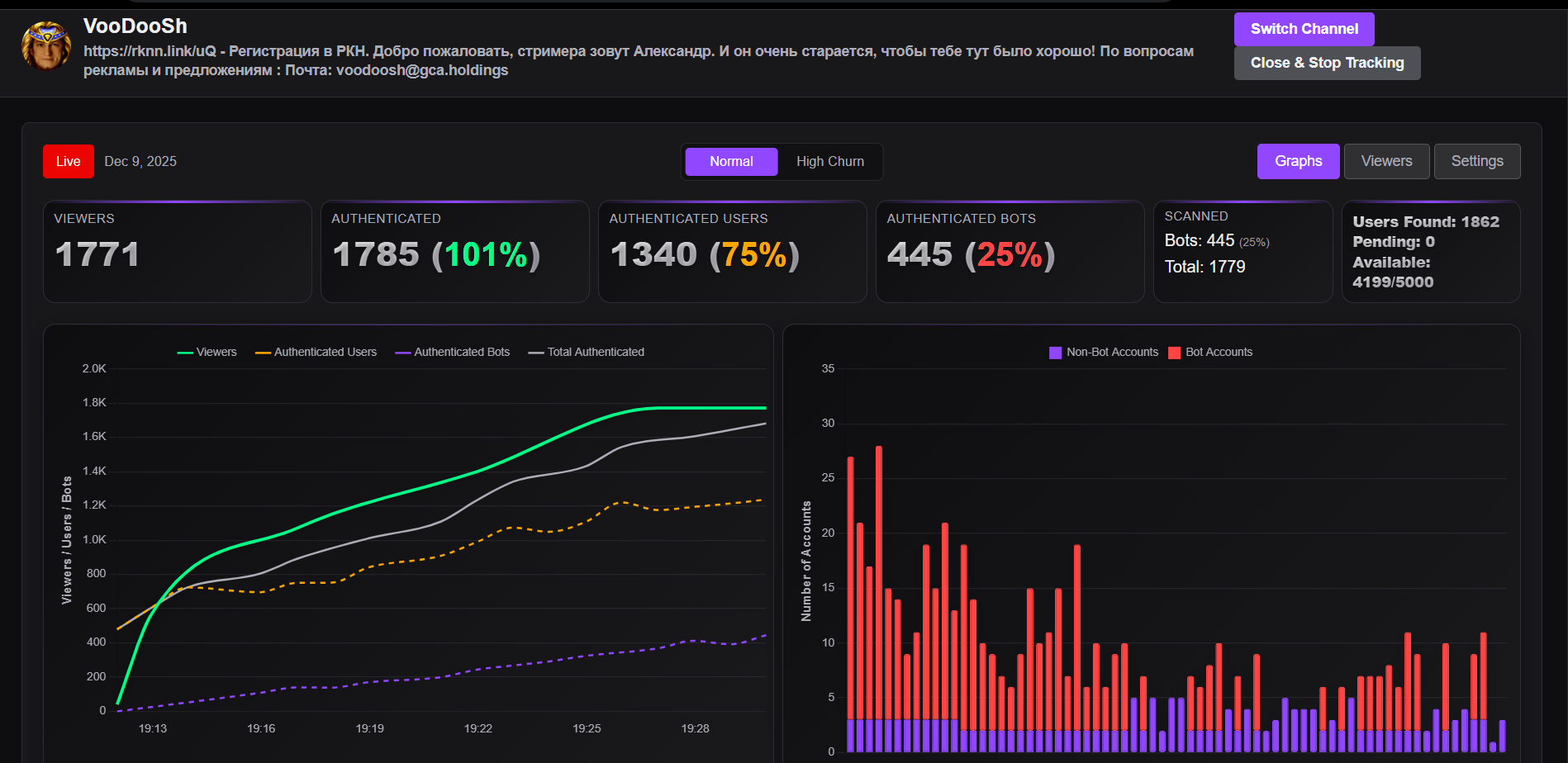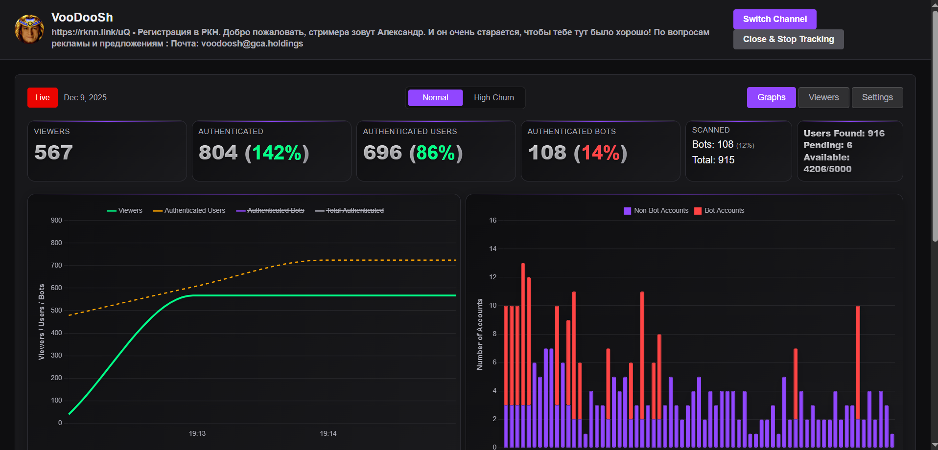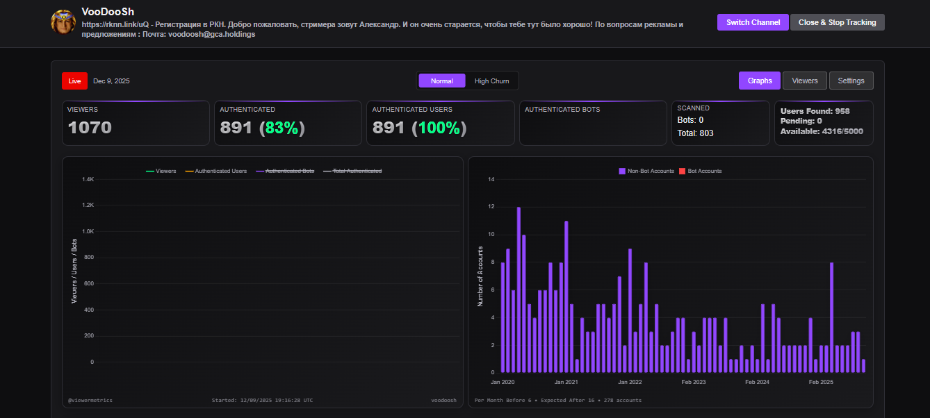 >Отслеживание зрителей Список зрителей загружается с настраиваемой периодичностью (по умолчанию: 5 секунд). Отслеживает время первого и последнего посещения для каждого зрителя. Удаляет зрителей, которые не появлялись в течение 5 минут (настраивается). Загружает даты создания учётных записей для новых зрителей в фоновом режиме.