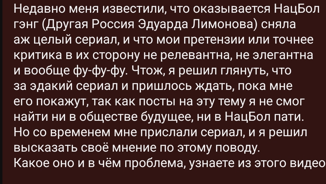 Соцреализм. Киргиз плачет почему человек симпатизирующий идеям нацболов не снял сериал про а хуй знает. По заветам гуру на ролик было потрачено 30 секунд, мое время слишком ценное чтобы тратить его на такое говно, а сам гуру из Киргизии показывает нам что можно обозревать продукты по чтению на вики Так что я без понятия о чем там он опять ноет, но используя опыт и те секунды которые я прослушал там речь опять про баб и сво. Откуда появилось СВО и квартиры в девяностых мне непонятно, но я всего лишь посмотрел сериал а малютка прочитала статью на вики. Ему знать лучше. Потрать малютка тридцать минут на просмотр серии, а не игру калфилд 6 она бы поняла роль нацболов в сюжете, но увы и ах. Для мамкиного национал социалиста любое искусство, где нет вождя (для него это Коля Носов и ссылка на его донайшен алертс) является afterkunst, поэтому сама идея, что человек который положительно относится к идеям Лимонова не сделал сериал где бравые нацболы зигуют под Катюшу для него чужда. Здесь должен был быть какой то вывод, вроде того что геймер аутист не понимает искусство, как концепт, но вместо вывода предлагаю обратить внимания, как ближе к концу во время чтения синопсиса серий малютка начинает яростно дрочить, имитируя кавказский акцент.