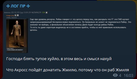 Еще про уровень ресерча. Райан говорит гг эту цитату перед тем, как раскрыть что ГГ это ГМО мутант запрограммированный беспрекословно подчиняться. Он буквально не может не подчиниться Райну. Это монолог не выбора, а финальное объяснение почему Джек будет всегда рабом Райна. То есть ты даже короткую видеоигру не в состоянии пройти, чтобы из неё правильно использовать цитаты.