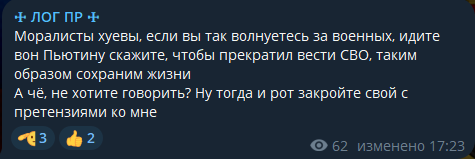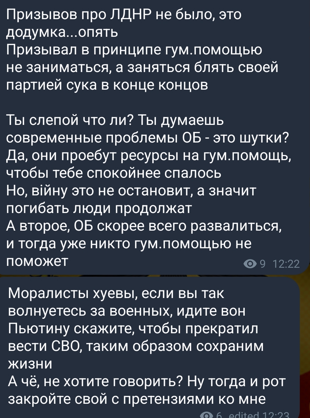 >А то куда мне до интеллектуалов "Листвы", Почему ты обижаешься? Ты сам призвал оставить людей из ЛДНР на произвол судьбы, потратив донаты на значки для ОБ. Почему то когда к тебе применятся такая же логика, как к абстрактному среднему человеку у тебя сразу начинается истерика.