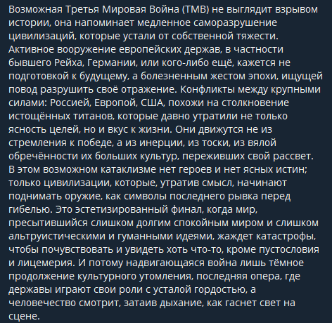 Пост сотканный из противоречий. Значки и костюмы вот что спасет ОБ от развала, а заниматься гуманитаркой нельзя сейчас и потом тоже нельзя будет. >Пьютину скажите, чтобы прекратил вести СВО, таким Ему даже Трамп сказал, но украинский диктатор Зеленский не хочет подписывать мирный договор. Вот вчера рада выписала русский язык из защищённых, но добавила ивирит. Почему они делают это время переговоров? Жду аналитику.