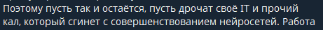 Жаль ты делитнул 22 минутное голосовое где пытался донести до людей "Почему я - лох" Называть обычное использование нейронкой - творчеством... Какой же больной ебанат
