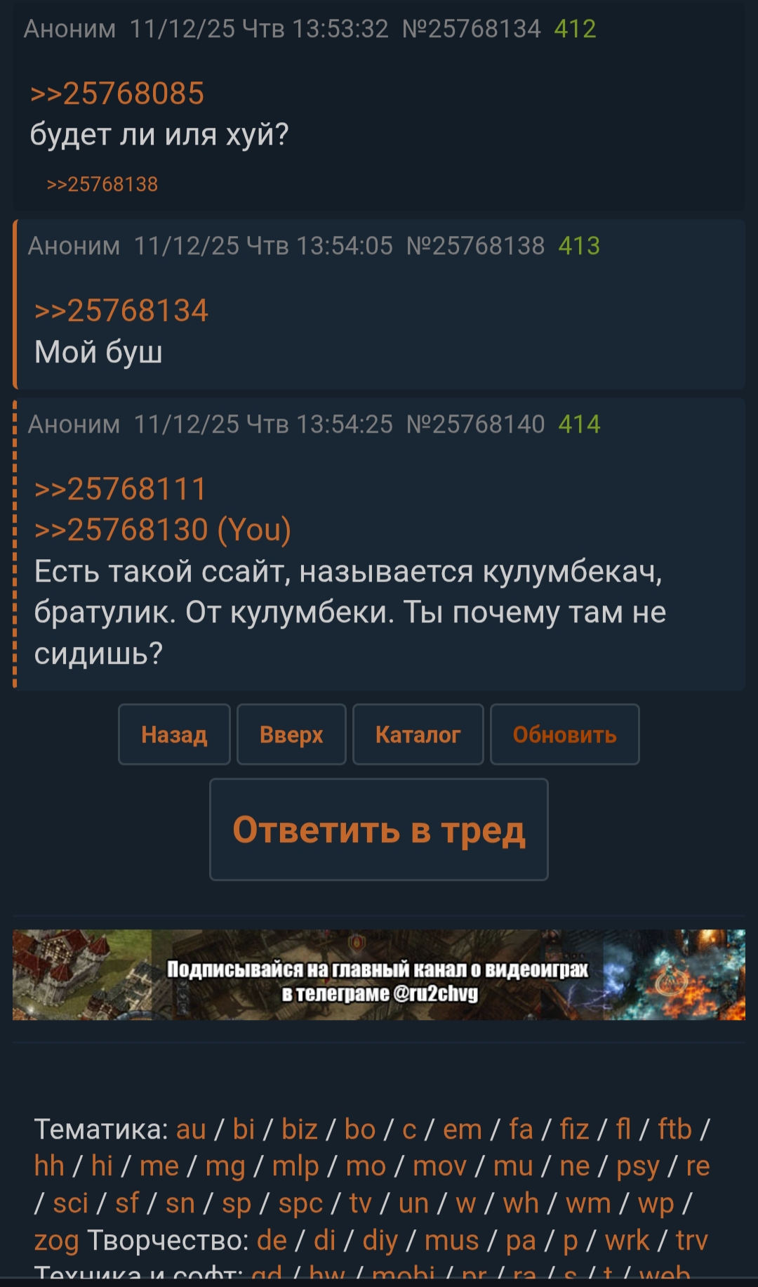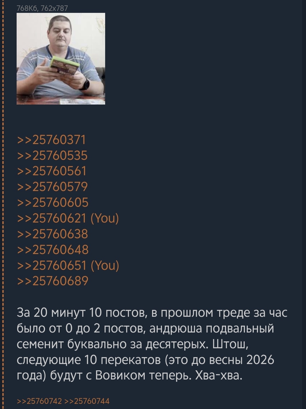 За 20 минут 10 постов, в прошлом треде за час было от 0 до 2 постов, андрюша подвальный семенит буквально за десятерых. Штош, следующие 10 перекатов (это до весны 2026 года) будут с Вовиком теперь. Хва-хва.