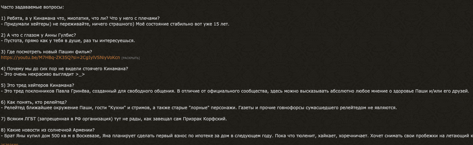 5) Это тред хейтеров Кинамана? - Это тред поклонников Павла Гринёва, созданный для свободного общения. В отличие от официального сообщества, здесь можно высказывать абсолютно любое мнение о здоровье Паши и/или его друзей.