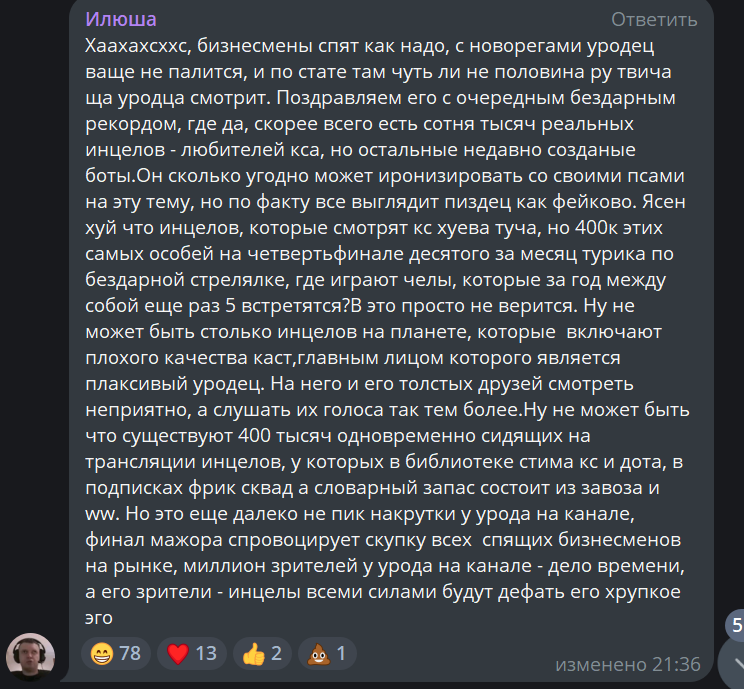 А почем в СИ все пишут про накрутку?Там я так понял Чмудисон СИ прорекламил?Все пишут что Эвелону дианочка спящих бизнесменов накрутила,а они знают что он даже ничего на твиче не рекламит и не знаком с Дианой?Я думал фаны короля это уже взрослые и умные люди а н нет