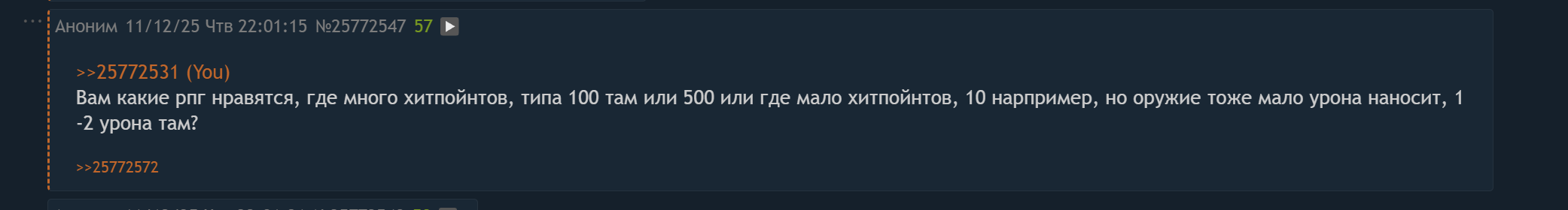 >>25772531 Вам какие рпг нравятся, где много хитпойнтов, типа 100 там или 500 или где мало хитпойнтов, 10 нарпример, но оружие тоже мало урона наносит, 1 -2 урона там?