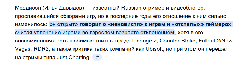 >>25772822 Честно говоря, я смотрю Илюху Мэда. И вместе с ним, я потерял интерес к играм, играть не могу вообще почти. За год, в лучшем случае 3 игры и те небольшие. Так они ещё и растягиваются на целый этот самый год. Ну, ладно, ухожу из треда, раз мне тут не рады, всем чао, пока. Добра и позитива!