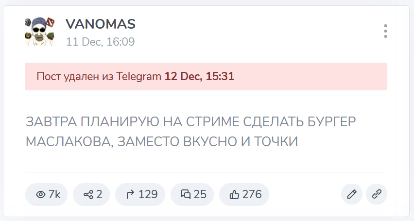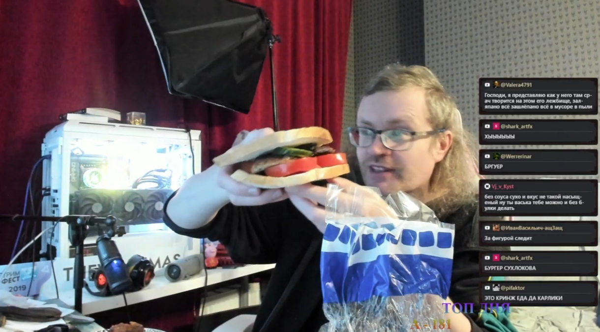 Там это, на стриме незаметно произошло приготовление "бургера маслакова": бомж притащил продукты в комнату, там же их нарезал за кадром, получился обычный бутер с хлебом. Всё.