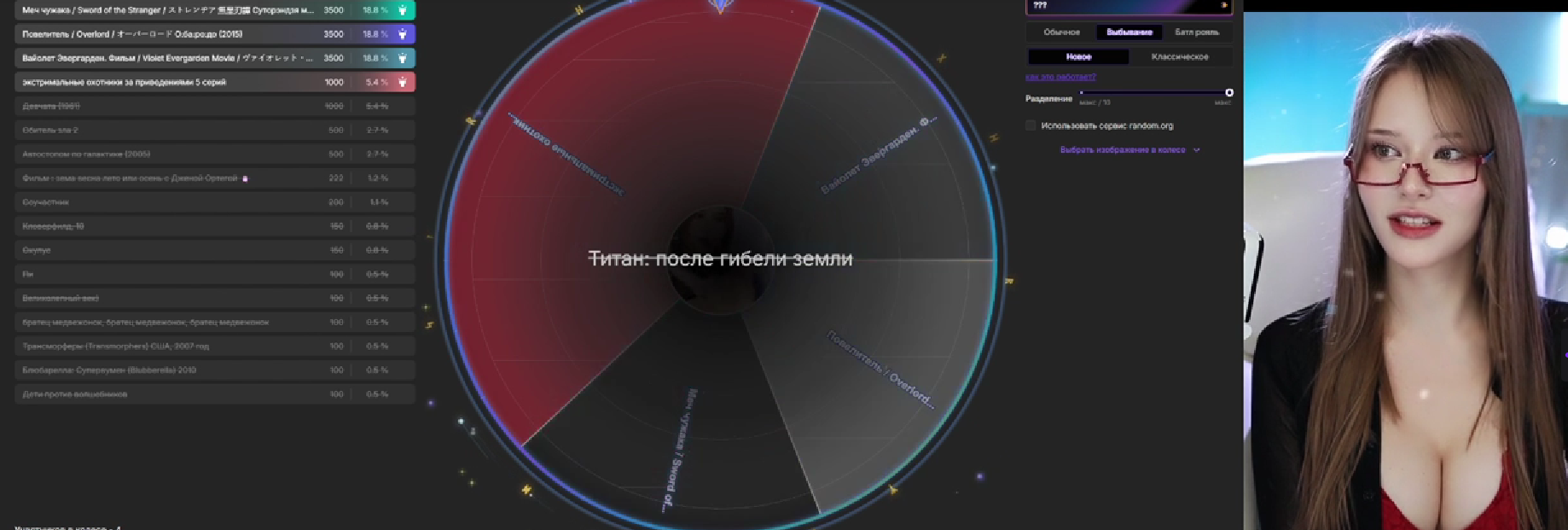 у одной мелкостримерши заметли интересный аук, там все варианты имеют равный шанс вылететь, и только когда останутся два, решает, сколько на какой занесли Очень годно, на самом деле