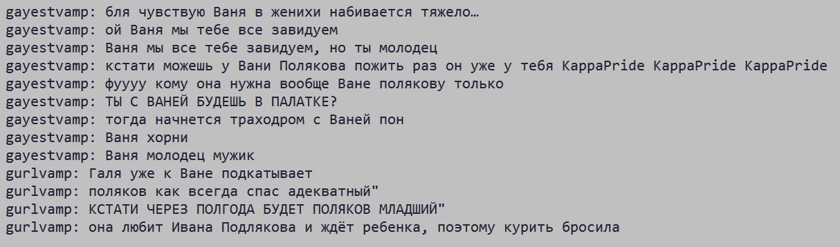 Аноним прав. Гавнина в степь поехала больной головой от одиночества и бессексия, внезапно для всех симпов решила испытать давно вынашиваемую идею отношений и семьи с нищим уродливым удобничем, который оказался под боком в удачный момент, омеган затерпит все плевки и измены, в том числе предложения оргии и секса Балдежу на стриме от любимой девушки. Это не был разумный выбор и настоящая любовь/влюбленность, Копроселиха не любила и не выбирала Полякова, троллила за чувства, в неожиданный момент шлюху переклинило и она прыгнула на первый удобный хуй поблизости вместо одиночества и пиздострадания, чтобы почувствовать себя полноценной свиноматкой с мужиком, план 5 летка реализовывается, семья, детки на готове, все по завету недалекой мамки, срущей на мозги 25 лет