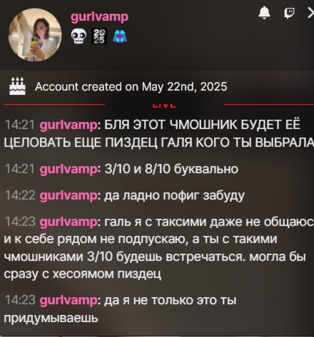 >>25802708 поплатилась пермачом за сообщение менее злобное чем были до этого вернулась уже на следующем стриме с акаунтом созданым месяцем ранее активно намекала чату что гавнина прямо щас чатится с самим чмодьем