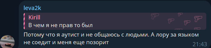 Сука, какое же аутичное. Пиздит про то, что не сидел обосранный и пошел ПОРЕШАЛ САМ НЕ ТЕРПИЛА, ряяя мне нужно было закрыться сидеть и плакать? ряяяя вас обоссут, а вам похуй будет. Чел поехал унизился, не допизделся САМ, а за счет Лору вышел героем ебать. С аналом так не пиздел бодро и смело, а тут герой, закрывшийся в своей комнатушке на ключ сука