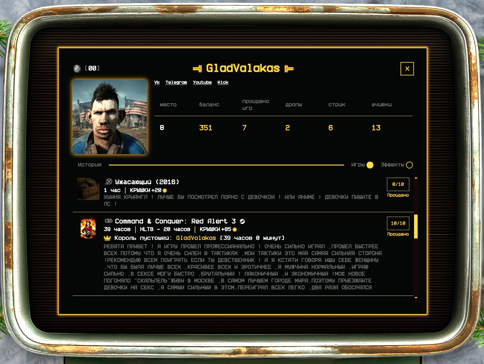 на нее смотришь. на ее поведение ОХУЕВШЕЕ.на то как она ВЫПРАШИВАЕТ игры...мошнит по кд на всех но когда к ней предъявл то она плачет. а еще меня больше веселит тот момент как она РВЕТ жопу лишь бы не оказаться на последнем месте прошл стрим 15 ч этот 20 часов сидела до талого на АУКАХ кидали что ей надо этот клоун Evill в соло ей 2 игры крайних надонатил (66 к) и обе выпали