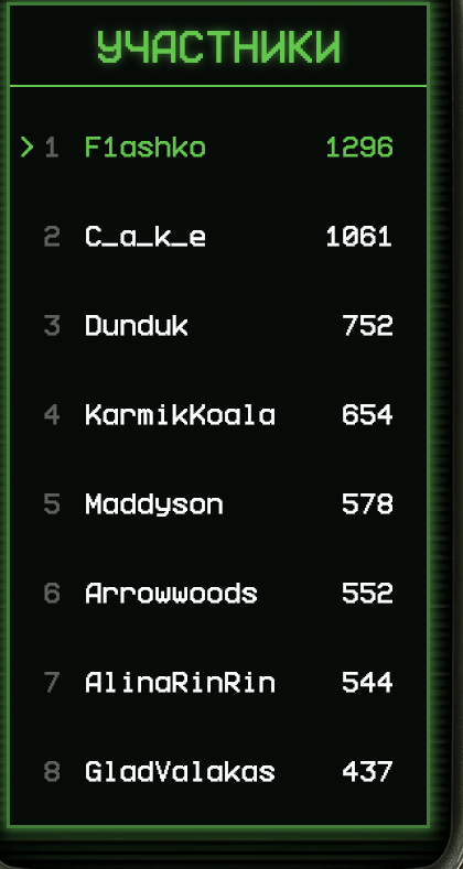 Алина рин спидранит резик забирает фишки мэда, обгоняет и его и аравула, мб играет ещё в чет и всё последнее место валакас, предпоследний арравуд потом потом мэд