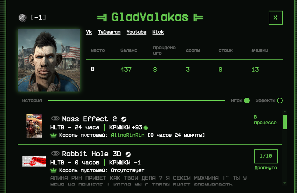 последние новости ивента на 22:37 жопич: с праденом пытаются заспидранить евил визин, чтобы отороваться от алины рин, получит 59 крышек, итого может алинарин: пытается заспидранить резик 4, получит 62 очка +15 отберет у жопича, итого может получить 606 валакас: с подсосом пытается заспидранить массэфект2, получит 93 очка +15 отберет у алинырин, итого может получить 545 аравудус: чешет лысину, пьет чай, терпит давку в донатах итого завтра у жопича будет 622, у алины 606, у валакаса 545, у аравудуса 606