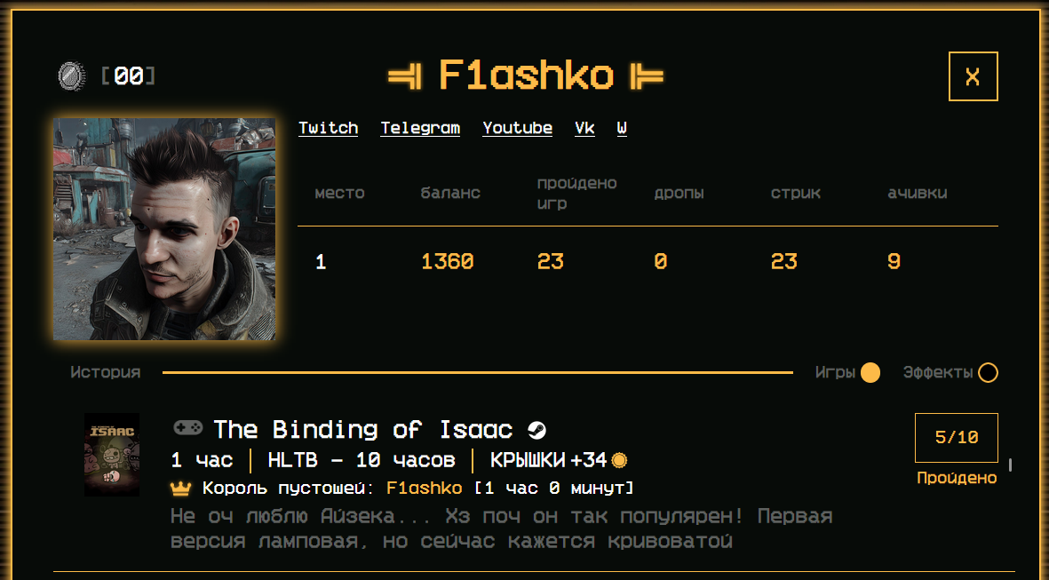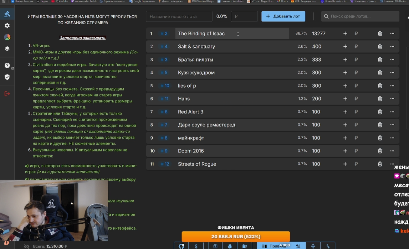 напомню для чего нужен СУДЬЯ: 1. Когда ты и сама, и хлтб проебываетесь, говоришь "время не то, я играла больше чем надо", СУДЬЯ просто с нихуя накидывает +25, а Валакасу за 40 часов ред алерта вместо 20 не накидывает. А мог бы просто сказать "сейчас ты прокрутишь все свои колеса, и я дам тебе 1-2 платиновые фишки для крутки, что бы эфферты не сгорели" 2. Когда ты сначала заставляешь проходить все кампании ред алерта, потому что они разные, а потом во властелине колец только за свет, потому что СУДЬЕ показалось что они одинаковые. Хотя они разные, я и в детстве играл, в этом году на стриме прохождение смотрел. 3. Когда СУДЬЯ говорит что психологический хорор на рпг мейкере это не хорор, потому что не страшно. Но при этом на другом ивенте СУДЬИ в жанре "хорор" выпадает рыбка фреди, потому что в тегах стима есть "хорор" это легетимная игра. 4. Когда СУДЬЯ сначала говорит что диспатч это отдаленно стратегия, но потом не стратегия. 5. Когда СУДЬЯ говорит что нужно пройти цикл в рогалике, но потом все таки не цикл, а так полигры. 6. Когда участник ивента начинает мошнить на другого, СУДЬЯ вместо того, что бы нормально разрешить ситуацию забивает хуй. Мог бы просто сказать "Алина, стратегия у Валакаса старый кал, мы её пытаемся запустить 30 минут, если нет то рерол. Если запускается, и постоянно крашится или мышка из игры улетает, то тоже рерол" 7. СУДЬЯ нужен что бы заставить Валакаса играть в игру, у которой нет времени на хлтб (только на все ачивки 1 оценка). И плевать, что весь ивент строится на времени с хлтб, в этот раз мы будем начислять крышки по фактическому времени, а снимать при дропе по сайту, то есть 1 крышку. А реролить нет нет нет.