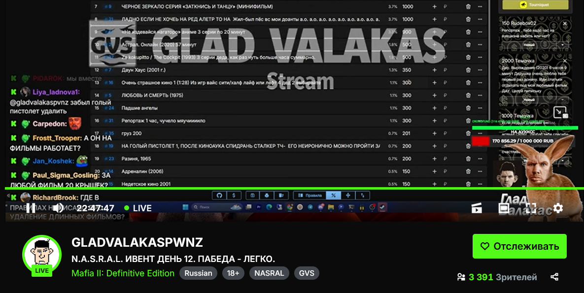 на секундочку, это последний день аукциона. медиатруп в виде валакаса поймал просто огромный темп, его уже вторую неделю смотрят 2-3к, он даже в вк стрим перестал включать. каблук алинырин 400-500к закинул на один день другим стримерам, чтобы обезопасить свою королевну. зрители чмодья до сих пор слепо преданы, жиржаржур или как ту малютку звали ночью сидела с кумиром детства, чтобы (не)смеяться над шутками короля. и все это ради того, чтобы стример не целовал пипиську. ну, а на скрине аравудус.