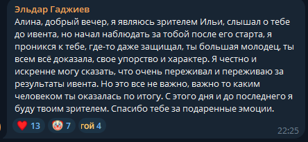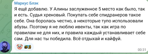 Ивент войдет в топ 5 предательств на твиче. Она была на 5 месте. При этом многие спидранили игры. Алине сняли 70 баллов . Еще и не хватило где-то 10-15 минут для прохождения майнкрафта. Алина сражалась до конца, стримила по 20 часов. Как львица среди стаи гиен. Она сделал все что смогла. Она молодец. У Алины чести и достоинства больше чем у всех их вместе взятых. Участвовать в таких ивентах это как играть с шулером в карты, ты всегда останешься проигравшим. Так что смотреть нужно не на результат а на то как себя человек повел в сложной ситуации, и все мы увидели что у Алины есть порох в пороховницах!!!