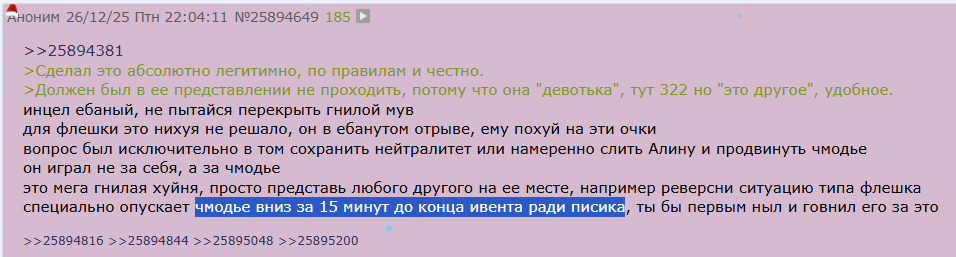 Зашел в тред Алины Рин почитать что пишут местные, а они правда не понимают что за такой мув флешка бы стал героем треда и получил статус главного протыкателя чмодья