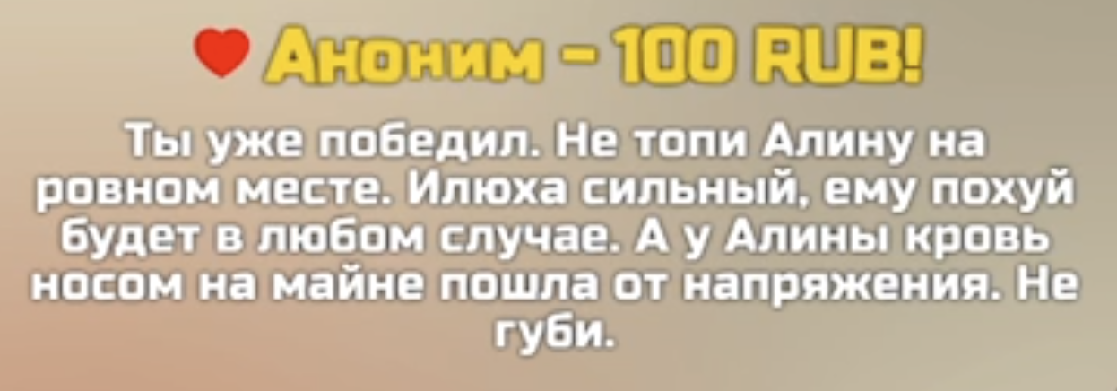 Так одно дело бабкиной симпы Донат тебя за которых ты не отвечаешь с которыми ты не общаешься а другое дело что у тебя есть и донатеры и твои подсосы с которыми ты просто в коктейльном сговоре участвуешь