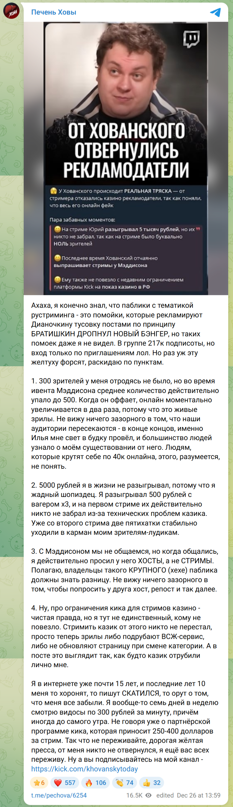 Там Хованского настолько НЕ трясет, что он выкатил ПОСТ (https://t.me/pechova/6254) на 5 страниц про то, какой он успешный.