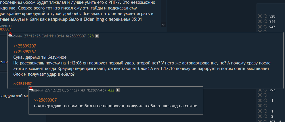 Аноны, есть основания полагать что Чмодье ебаное проходил игры с читами. Посмотрите на момент боя Чмодья с Краузером на ножах 1:11:41 https://kick.com/maddyson/videos/56325540-6ef4-4e2a-a3d2-801f29151f21 он не пропустил почти ни одного удара кроме тех случаев когда он сам бил ножем. Во время того как бьешь ты не можешь блокировать, и только поэтому он пропустил пару ударов, а все остальные заблокировал, в том числе сложную серию из 5 ударов Краузера под ряд на 1:12:51 Все кто проходил RE4 знают что этот бой с Краузером на ножах довольно сложный, и его невозможно пройти с первого раза потому что ты тупо не знаешь тайминги его ударов. Для того что бы научится так парировать и не пропускать большинство ударов нужно как минимум несколько смертей, или какое то время потренироватся парировать до этого, а Чмодье на протяжении двух стримов RE4 не разу не тренировался в пировании. У него просто стоит вот этот чит на автопарирование при котором не надо ловить тайминги для блока а гг блокирует удары автоматически https://www.nexusmods.com/residentevil42023/mods/379 Лучше всего это видно на этом моменте >4:45:53 при передвижении наискосок влево парировал очень сложный удар, у него стоит чит на автопарирование. В чате все охуевают с того как он якобы ловко запарировал, и постят смайлы удивления https://kick.com/maddyson/videos/56325540-6ef4-4e2a-a3d2-801f29151f21 Все кто играл в RE4 знают что когда ты убегаешь от противника в бок то у тебя внимание сразу в первую секунду переключается на поиск безопасного маршрута что бы не попасть под удары других врагов, и в этот момент тебе не до парирования. А тут он убегая в бок когда внимание сосредоточено на поиск безопасного маршрута внезапно запарировал очень сложный удар. Вот это и показывает что Чмодье ёбаное играл с читами. А раз он играл в RE4 с читами, то скорее всего он и другие игры проходил с ними. Значит его должны либо дисквалифицировать с Ивента, либо прохождение RE4 не в счет и он не получает за него 63 крышки в рейтинге ивента. Значит на последнем месте он а не Алина Рин.