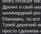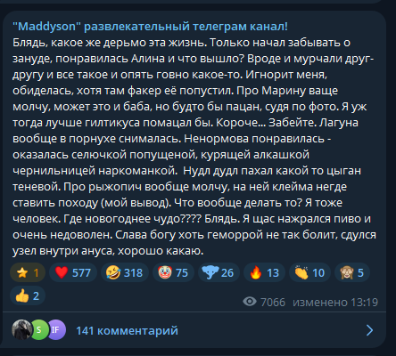 Блядь, какое же дерьмо эта жизнь. Только начал забывать о зануде, понравилась Алина и что вышло? Вроде и мурчали друг-другу и все такое и опять говно какое-то. Про Марину ваще молчу, может это и баба, но будто бы пацан, судя по фото. Я уж тогда лучше гилтикуса помацал бы. Короче... Забейте. Лагуна вообще в порнухе снималась. Ненормова понравилась - оказалась селючкой попущеной, курящей алкашкой чернильницей наркоманкой. Нудл дудл пахал какой то цыган теневой. Про рыжопич вообще молчу, на ней клейма негде ставить походу (мой вывод). Что вообще делать то? Я тоже человек. Где новогоднее чудо???? Блядь. Я щас нажрался пиво и очень недоволен. Слава богу хоть геморрой не так болит, сдулся узел внутри ануса, хорошо какаю.
