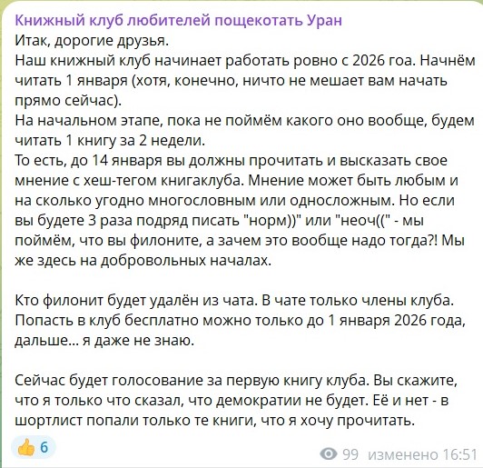 >>25826633 >>25826965 >>25826977 Вас реально задевает восклицания "чтоб, ты сука сдох"? Вы серьезно ребят? Ну нельзя же быть настолько соевыми снежинками. Мы с корешами может в формате пост-иронии и смерти друг другу пожелать, и мамок друг друга выебать, и представьте никто не обижается. Я даже больше скажу, такие высказывания только укрепляют нашу дружбу. Слова это всего лишь слова, о людях надо судить по их поступкам. А по поступкам кадавр чист как слеза младенца, ничего плохого он никому не сделал, кто бы что тут не говорил. Сына не бросил, мочеглотов не пребывает - они сами по своей воле переводят деньги. Просто кадавр мизантроп, но безобидный мизантроп как наверное и я, поэтому его тип личности мне и близок. А вы тут корчите из себя моралистов, хотя я уверен у вас скелетов в шкафу будет поболее чем у кадавра.