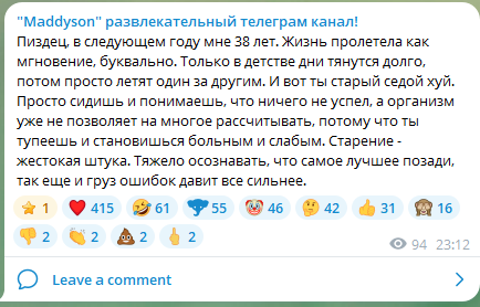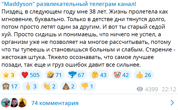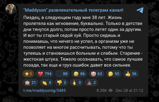 Просто представьте, чел реально сидит здесь, смотрит Мэда, видит и слышит постоянно обсуждение про марамоек, как то у одной то у другой теневые вскрываются, как их образы рушатся, слушает всю базу про женщин от Илюхи и от местных блекпильщиков. И СУКА ПРОДОЛЖАЕТ ВЕРИТЬ ЧТО У КОГО-ТО ТАМ НЕТ ТЕНЕВОГО И ЧТО ОНА НЕ ДВУЛИЧНАЯ МРАЗЬ