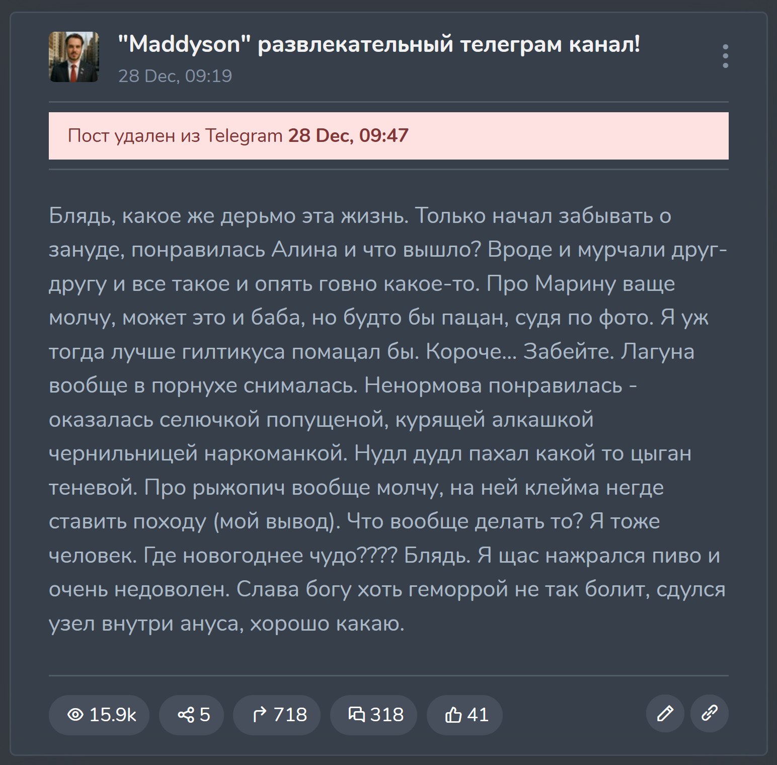 Илья, [29.12.2025 10:28] Вы же понимаете что без Илюхи Мэда даже постинг здесь ослабнет? Конечно первые года два продолжиться чисто на инерции и обсуждении того, какой была бы жизнь, если бы илюха не подох. Но потом абсолютно ВСЁ. Никто из местных не станет смотреть всех подсосов без Илюхи. Останутся исключительно симпы разных марамоек. Интернет закончится на Илюхе